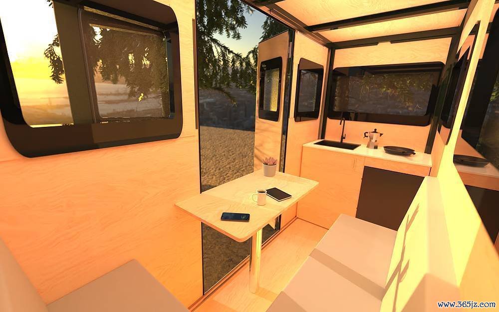 T1 露营车的外不雅造型别具一格,车长 120 英寸(305 厘米),高 114 英寸(290 厘米),其 48 英寸宽的里面空间虽相较于平常露营车略显局促,但 6.7 英尺高(2 米)的天花板却能让大精深成年东谈主在车内站直,创造出 280 立方英尺(8 立方米)相对宜居的生涯空间。其 360 度车窗更是一大亮点,不仅为车内提供了邃密的采光与视线,也让居住者在路径中能全场所地感受周围的当然景不雅与环境变化。