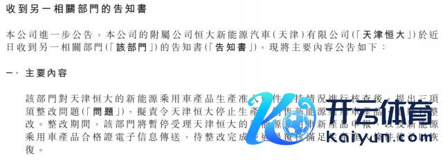 2024 年 6 月,恒大汽车发布公告暗示,公司附庸公司恒大新动力汽车(天津)有限公司收到关系部门见告书,该部门对天津恒大的新动力乘用车家具分娩准入条目保合手情况进行核查后,提倡三项须整改问题,拟责令天津恒大住手分娩、销售新动力乘用车家具,并进行整改。整改时代,该部门将暂停受理天津恒大的新动力乘用车新家具呈文,以及新动力乘用车家具及格证电子信息传送,待整改完成并通过复核闲隙分娩准入条目后赐与规复。