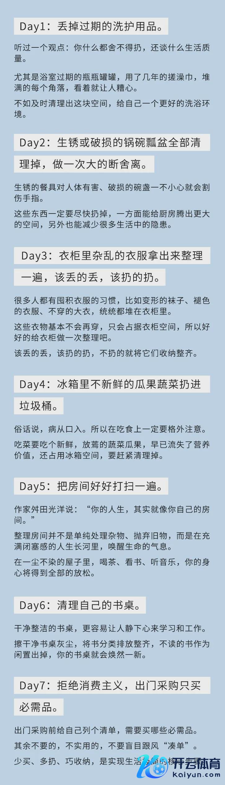 用一周的时期,扔掉过剩的物品,整理好家居环境,当房间收复干净整洁,东谈主也会回到积极的情景中。