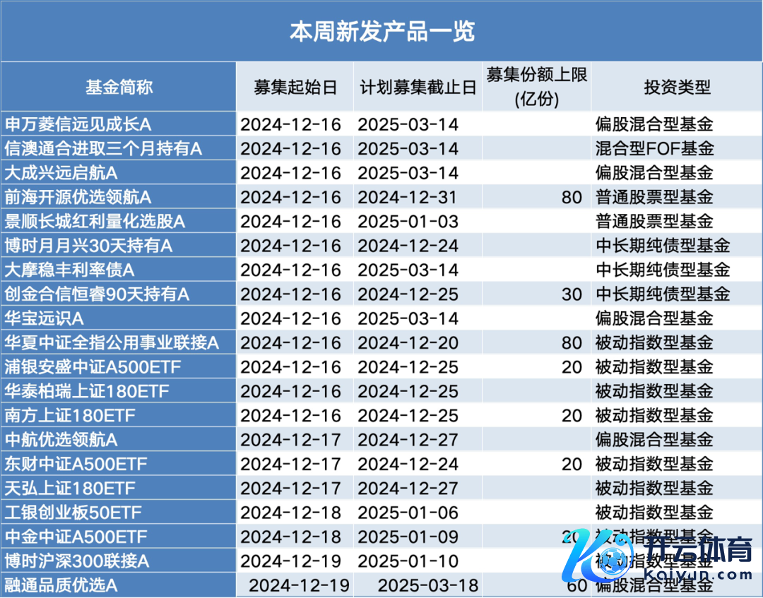 本周(12月16日至12月20日),全商场共有20只新基金(仅统计主代码,下同)登台亮相。其中,权利品种已经刊行主力,宽基指数基金是亮点。