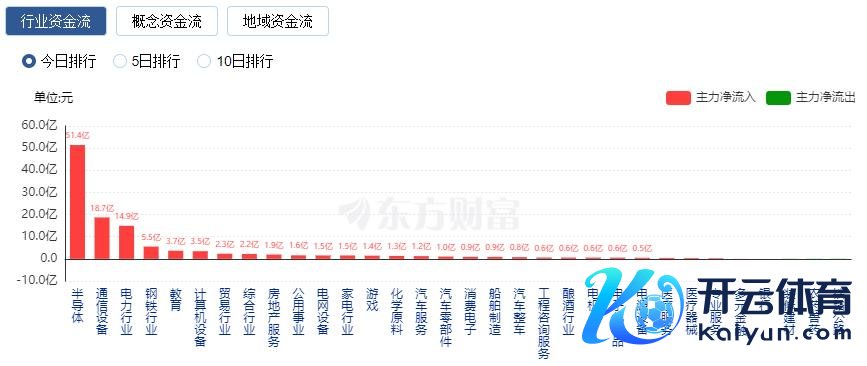 行业资金方面,限制收盘,半导体、通讯缔造、电力行业等净流入名次靠前,其中半导体净流入51.40亿。