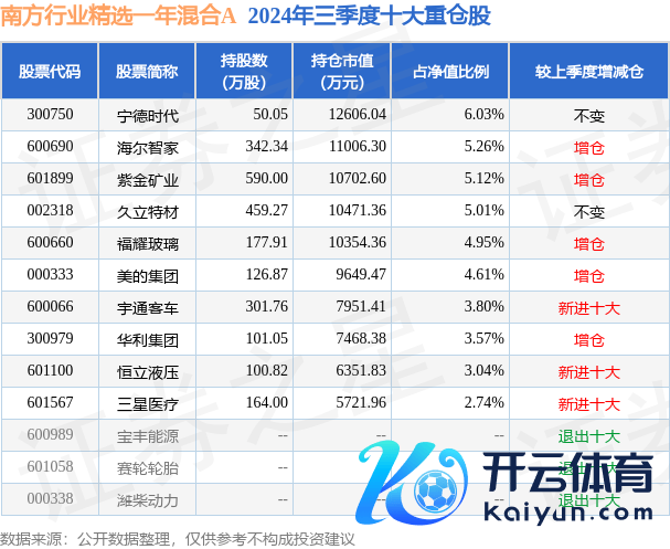 南边行业精选一年羼杂A为羼杂型-偏股基金,阐述最新一期基金季报表示,该基金财富确立:股票占净值比89.88%,无债券类财富,现款占净值比6.31%。基金十大重仓股如下: