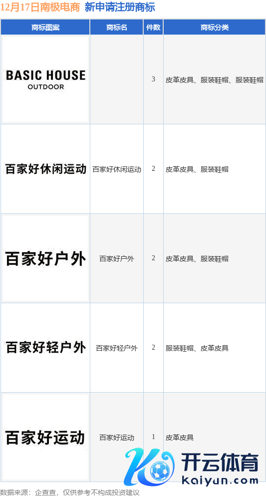 本站音书体育游戏app平台,说明企查查数据泄露,近日南极电商股份有限公司新提交“百家好空隙畅通”、“百家好轻户外”等10件商标注册请求。商标请求确定如下: