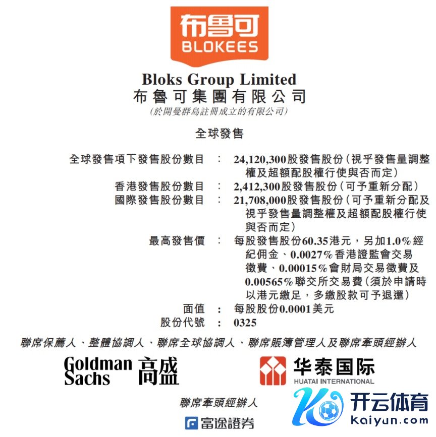1月7日上昼,布鲁可末端了在港公开招股。这次IPO,布鲁可拟发售约2412.03万股股份,其中在港公斥地售占10%,国际发售占90%,另有15%逾额配股权,每股发售价不卓绝60.35港元,每手交易单元为300股。