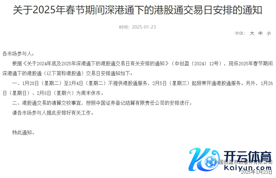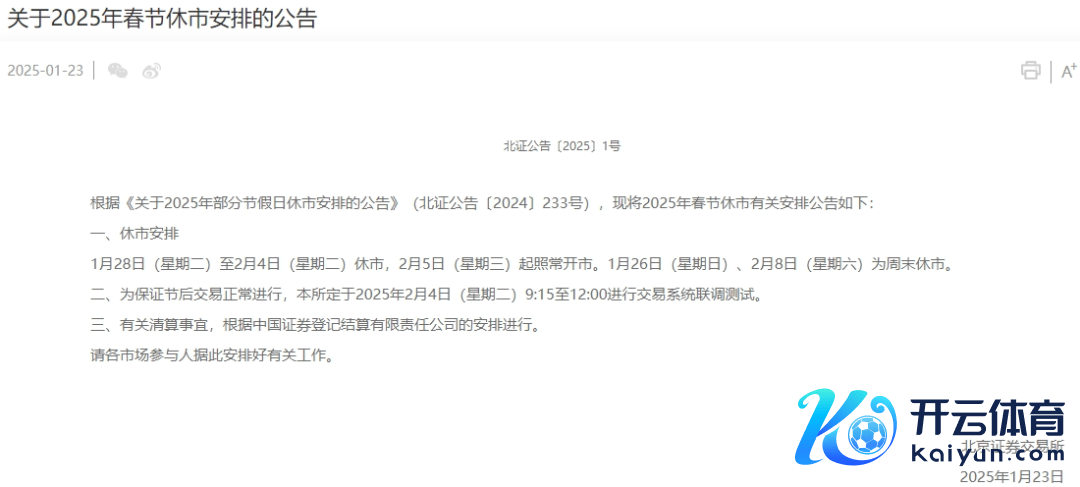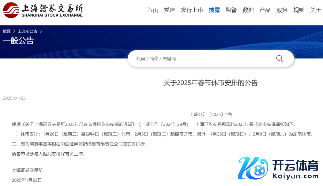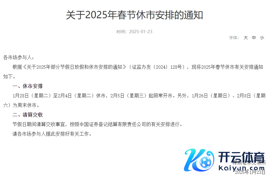 1月23日,沪深北往来所分裂发布对于2025年春节休市安排的见告。据见告,1月28日(星期二)至2月4日(星期二)休市,2月5日(星期三)起照常开市。另外,1月26日(日曜日)、2月8日(星期六)为周末休市。