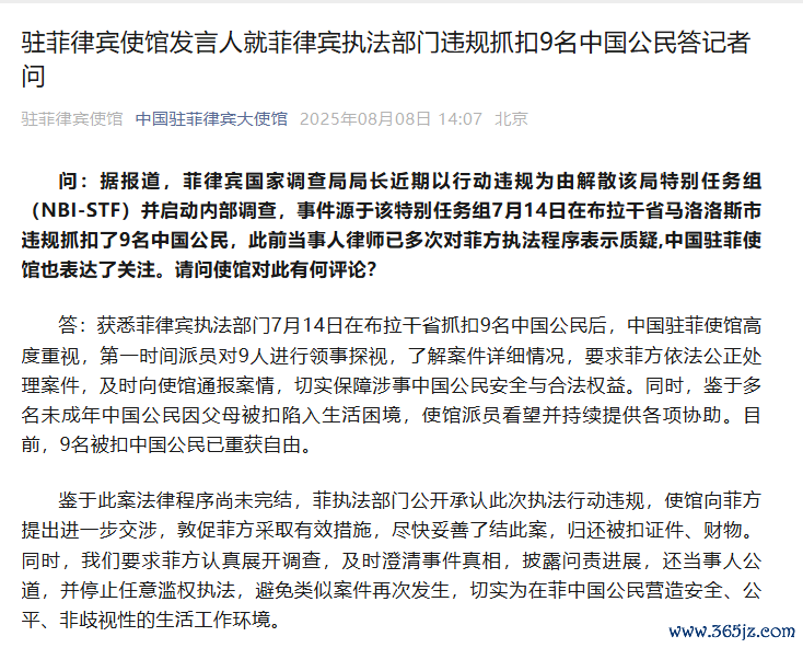 据中国驻菲律宾大使馆微信公众号音讯开yun体育网,驻菲律宾使馆发言东谈主就菲律宾规矩部门违纪持扣9名中国公民答记者问。