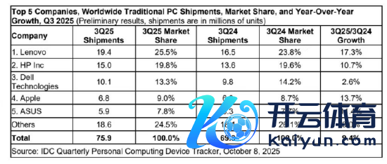 新浪科技讯 10月10日中午讯息,凭证海外数据公司(IDC)《民众季度个东说念主规画竖立跟踪求教》发布的初步遵守披露,2025年第三季度,民众传统个东说念主电脑(包括台式机、札记本电脑和责任站)市集出货总量达到7590万台,相较于昨年同时(6930万台)增长了9.4%。