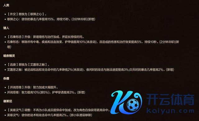 而仔细征询此次的公告会发现,如实官策划对一些广为诟病的东西进行了一次升级,比如说东说念主类中的【酬酢】替换为【雄狮之心】。雄狮之心:使你的暴击几率升迁15%,抓续15秒。而矮东说念主的【石像步地】升级:新增增伤与调治加成,并蔓延抓续技能。况兼暗夜精灵的【迅捷】替换为【艾露恩之触】。其他也发生了改变,具体见下图。