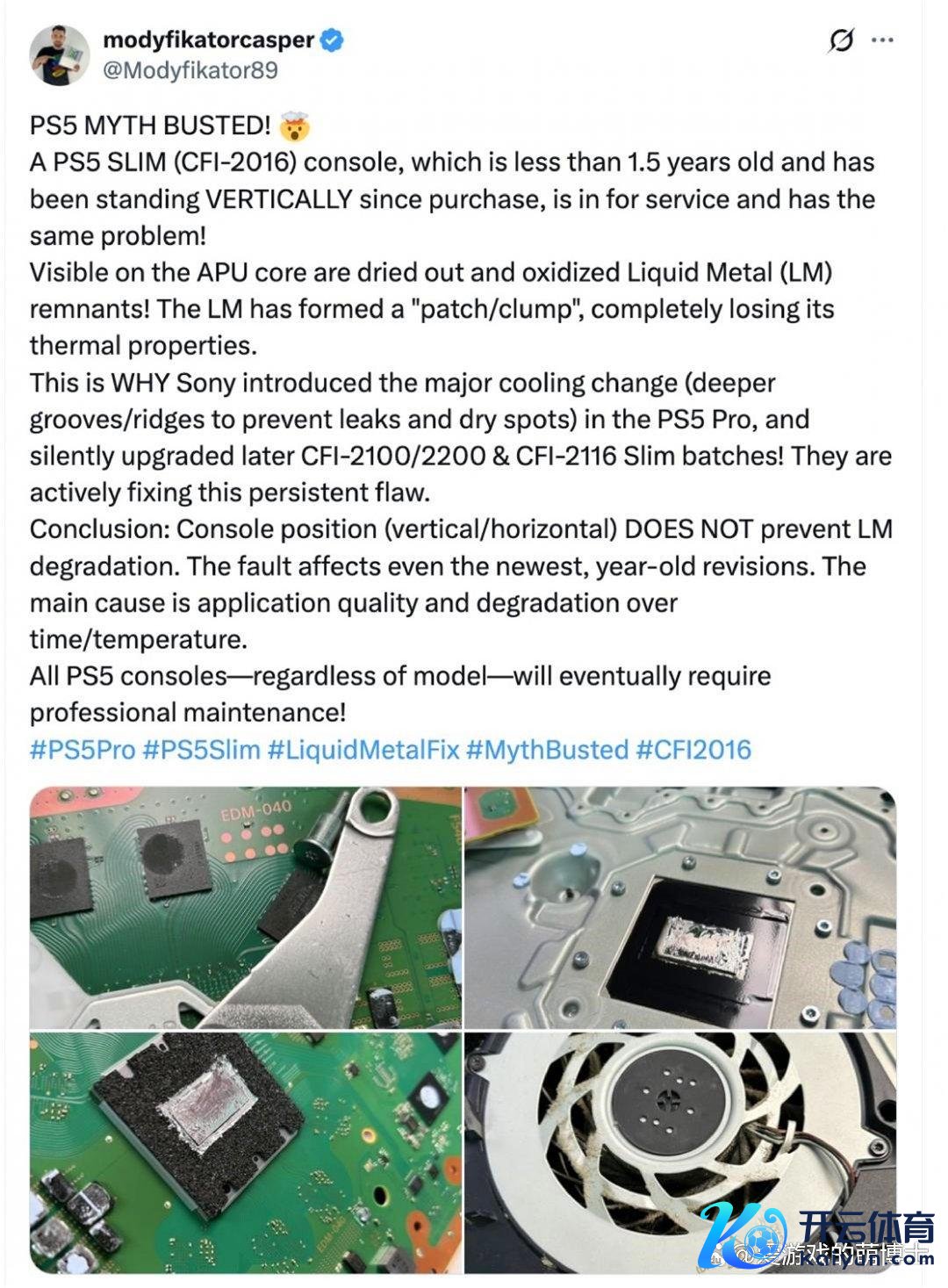 这位民众直言:这诠释摆放情势根柢不是要害,真实的过失在于液态金属的启动涂覆品性,以及耐久高温轮回下的当然老化,致使斗胆断言“悉数PS5主机最终齐需要维修”。诚然这个不雅点略显已然,但液态金属有关故障如实耐久困扰着部分玩家。当今已知的故障案例仍以早期PS5型号为主,不外跟着越来越多主机参预使用周期,雷同问题有逐渐加多的趋势。有行业从业者此前就曾指出,玩家反映的PS5突发过热、自动关机等故障,好多齐能回顾到液态金属失效。而此次CFI-2016型号的故障案例也让天下相识到,即就是后续推出的新版块,也没能满盈遁藏这个隐患。