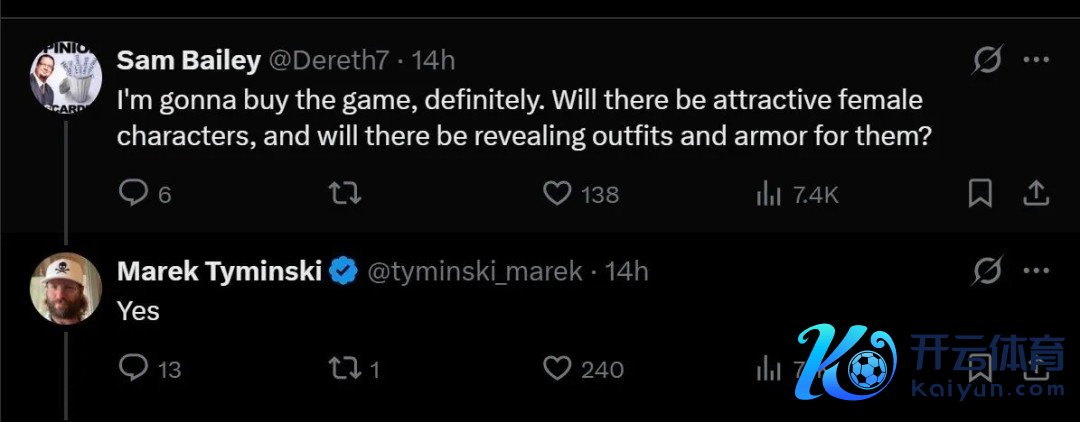 在该文挑剔区有玩家筹商:“我会买这款游戏。游戏中会有漂亮女角吗?她们会有露馅服装和盔甲么”,Marek Tyminski报恩称:“虽然”。他还认可了“游戏应该兴趣,而不是政事正确”的说法。