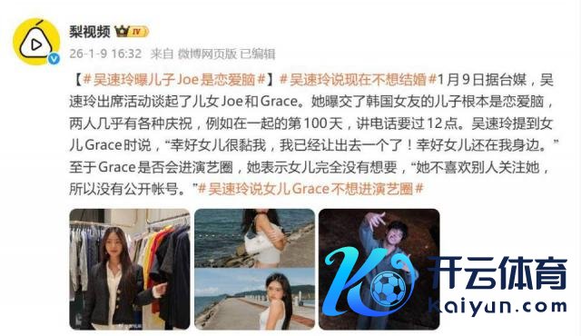 比较女儿千里浸在甘好意思的二东谈主寰宇,吴速玲对女儿 Grace 则显得"宽心"好多。她运气"幸亏女儿很黏我",并清楚 Grace 通盘莫得进攻演艺圈的盘算推算,因为"她不可爱别东谈主温雅她",连酬酢账号都未公开。这一动一静,一"出让"一"留守"的对比,组成了吴速玲行为母亲确当下心情。
