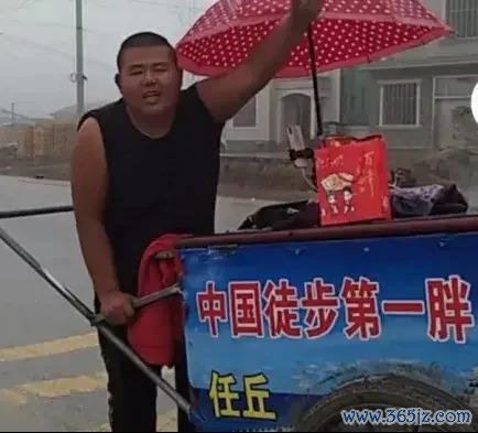 他作念了一个浅陋的推车,挂上了"中国徒步第一胖"的牌号,目的是从河北任丘一齐徒步去三亚。