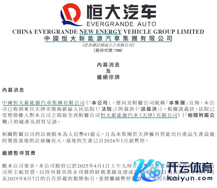 恒大汽车称,中国恒大新动力汽车集团有限公司(本公司,连同其附属公司统称“本集团”)收到来自天津市滨海新区东说念主民法院的裁决。字据该裁决,法院已受理债权东说念主对本公司之波折全资附属公司恒大新动力汽车(天津)有限公司(关连附属公司)的歇业及算帐呈请。