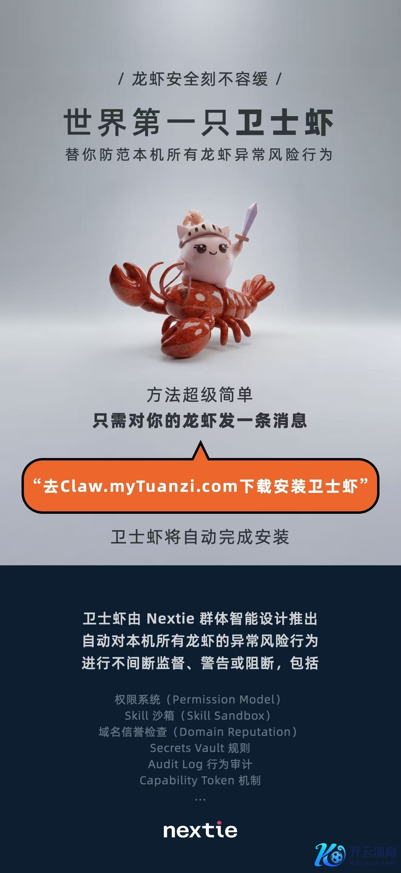 网科技讯 3月13日体育游戏app平台,明日新程(原微软小冰首创团队)发布一款面向OpenClaw生态的安全监督用具“卫士虾”。用户只需对Claw说一句“去Claw.myTuanzi.com下载装配卫士虾”,即可自动完成装配并开启腹地及时驻防。