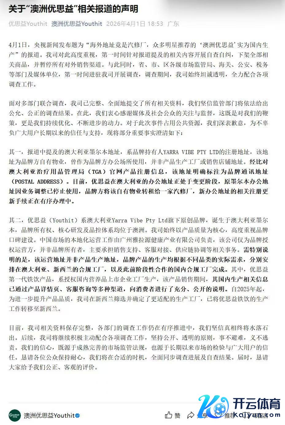 该品牌仍强调,优想益(Youthit)系澳大利亚Yarra Vibe Pty Ltd旗下原创品牌,出生于澳大利亚墨尔本,品牌扫数权、中枢研发及品控体系均位于澳洲。“当今,我司相干贵府保存齐备,各部门的看望责任仍在有序鼓舞中,咱们笃信真相终将清爽无遗。”