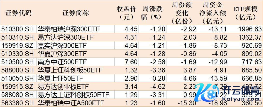 具体ETF方面,界限较大的10只宽基指数ETF本周统共净流出66.93亿元,其中华泰柏瑞沪深300ETF、南边中证500ETF、中原上证50ETF、华泰柏瑞中证A500ETF净流出均超10亿元。