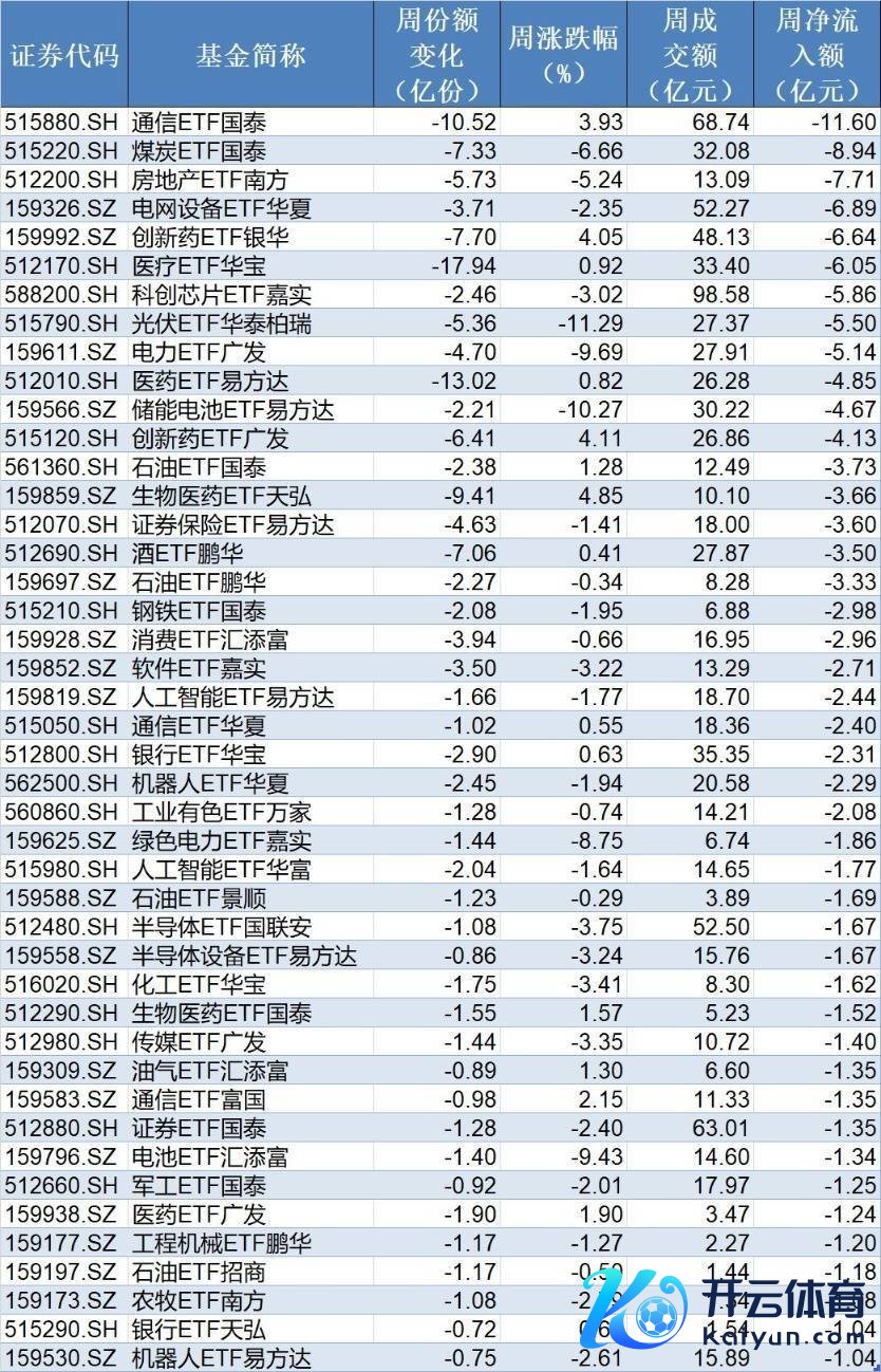 在资金流出方面,本周有44只行业主题ETF净流出逾1亿元,其中通讯ETF国泰、煤炭ETF国泰、房地产ETF南边份额差别减少10.52亿份、7.33亿份和5.73亿份,差别净流出资金11.6亿元、8.94亿元和7.71亿元。